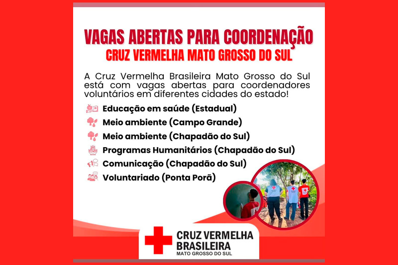 A Cruz Vermelha Brasileira Mato Grosso do Sul está abriu vagas para coordenação em cinco atividades voluntárias em diferentes municípios do Estado. Para Chapadão do Sul, são três vagas; Meio Ambiente, Programas Humanitários e Comunicação.