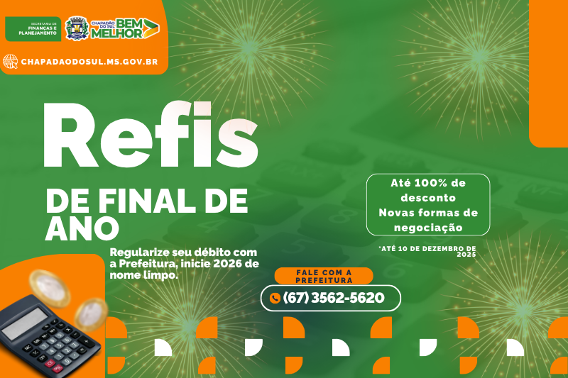 A Prefeitura de Chapadão do Sul  lançou o refis de final de ano, programa criado para ajudar quem deseja encerrar o ano com nome limpo e a as contas em dia com o município. Essas condições fornecem formas de negociação jamais feitas antes em Chapadão do Sul.