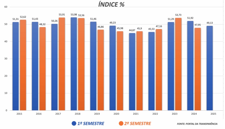 Apesar do crescimento acumulado das despesas, o índice de gasto com pessoal registrado no primeiro semestre de 2025 ficou em 49,13% (até junho de 2025), abaixo do limite prudencial estabelecido por lei.