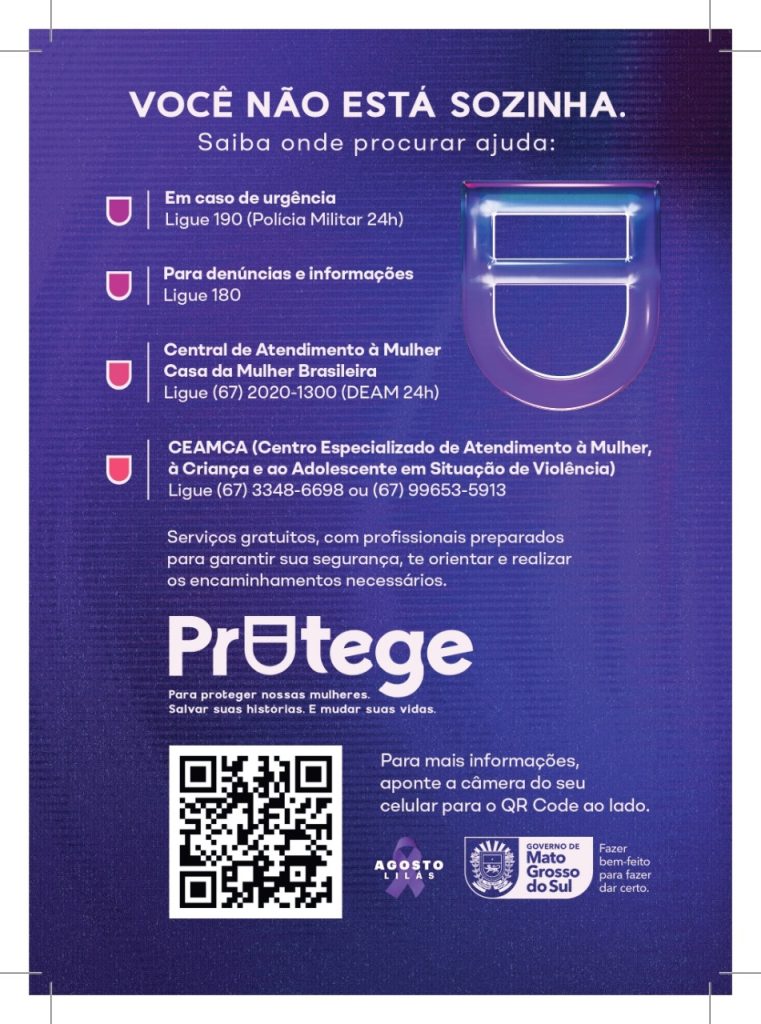 O Governo de Mato Grosso do Sul lançou a campanha “Protege”, uma iniciativa permanente e integrada que busca proteger mulheres em situação de violência, salvar histórias e transformar vidas. A ação reúne uma ampla rede de serviços gratuitos, atuando de forma intensa e contínua para oferecer segurança, acolhimento e orientação às vítimas.