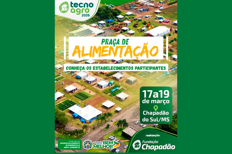 A praça de alimentação da Tecnoagro promete ser um dos espaços mais movimentados do evento, que será realizado de 17 a 19 de março, reunindo diversas opções gastronômicas para atender o público visitante. A iniciativa conta com a organização da Prefeitura de Chapadão do Sul, por meio da Secretaria de Desenvolvimento Econômico e Meio Ambiente (SEDEMA), integrando esse grande evento promovido pela Fundação Chapadão e incentivando a participação de empreendedores locais.