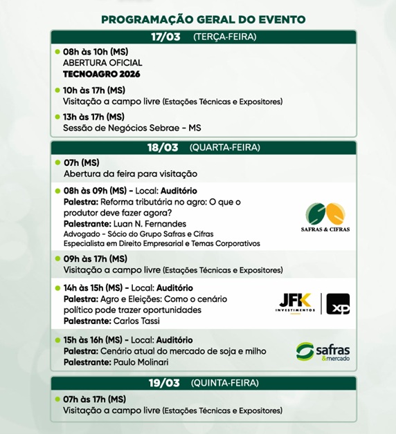 Venha viver a Tecnoagro 2026, dos dias 17 a 19 de março das 7h as 19h (horário MS), com entrada franca .