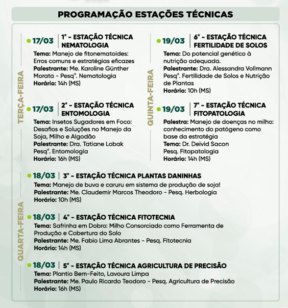 Além da exposição de empresas e demonstrações de tecnologia no campo, a programação conta com palestras, encontros técnicos e momentos voltados para negócios e inovação, conectando produtores, startups e especialistas do setor.