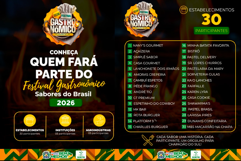 Chapadão do Sul já está pronto para viver uma das maiores edições do Festival Gastronômico – Sabores do Brasil. Agora, o público já pode conhecer os 30 participantes que vão disputar o título de Melhor Prato do Festival. De 30 de abril a 2 de maio, na Praça de Eventos, sempre a partir das 17h30 (MS), o público poderá circular pelas estações gastronômicas e descobrir novos sabores.