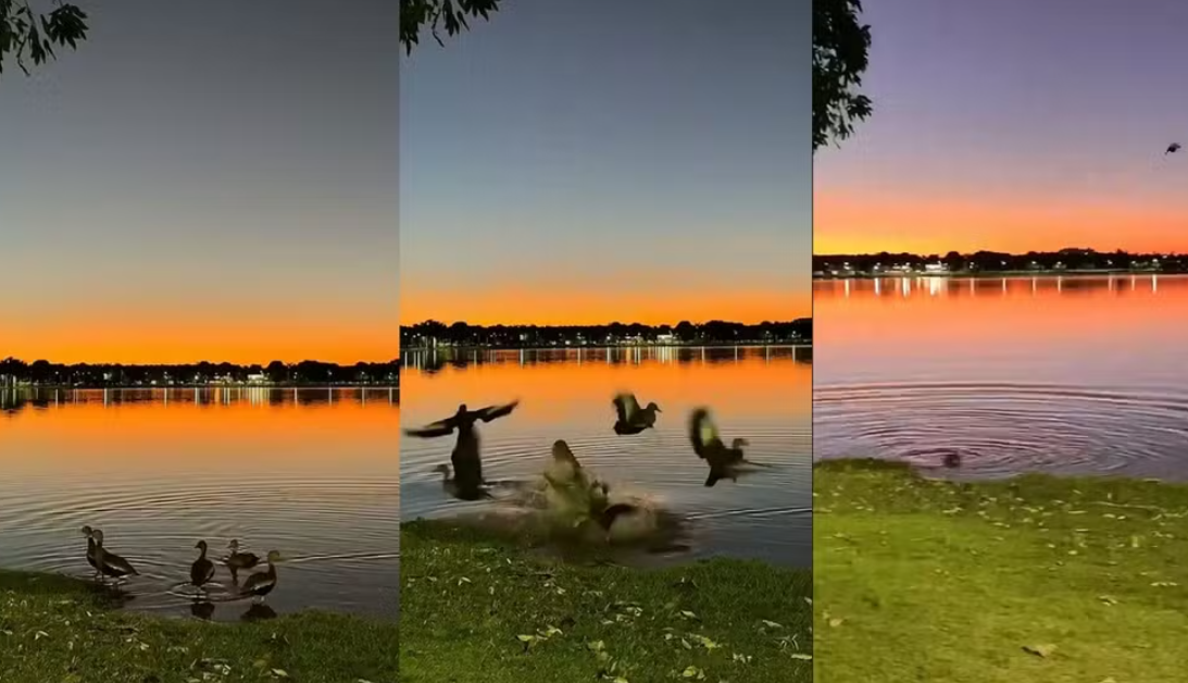Jacaré ‘invade’ cena e tenta abocanhar patos em lagoa de cidade de MS